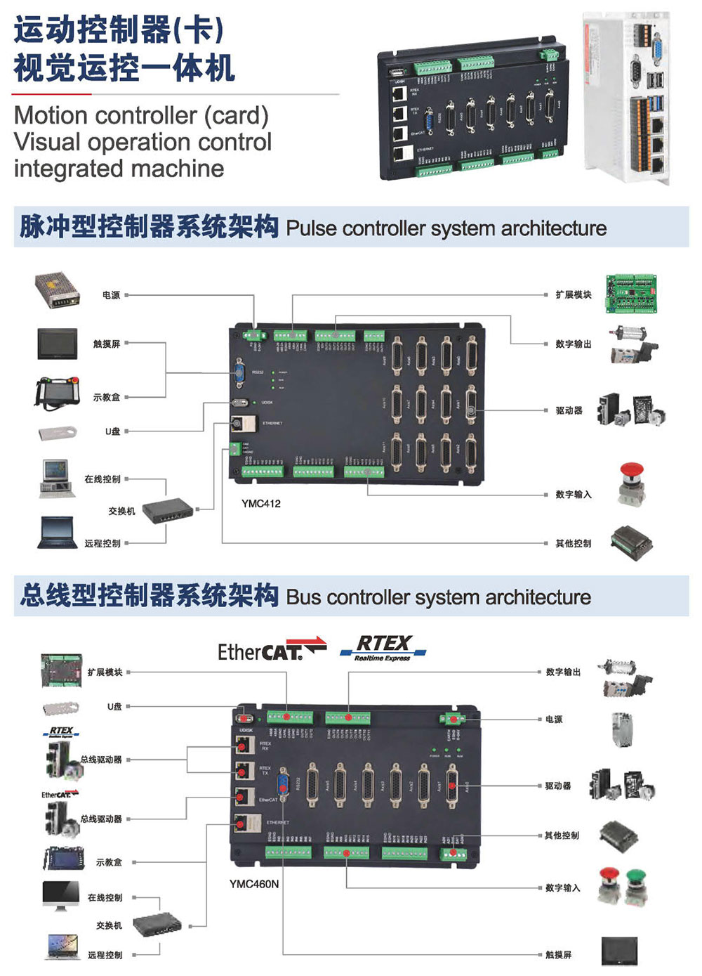 YMC3E/N系列高性能多轴运动控制器是一款兼容EtherCAT总线 (其中N支持EtherCAT.RTEX双总线)和脉冲型的独立式运动控制器。控制器本身最多支持16轴( EtherCAT总线或RTEX总线+脉冲) , 可扩展至24轴的复杂的连续轨迹控制需求。