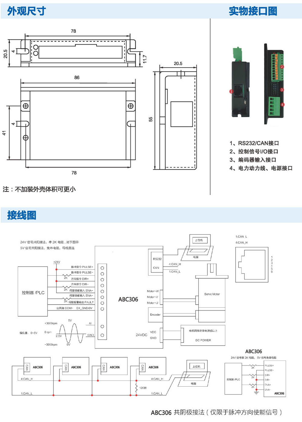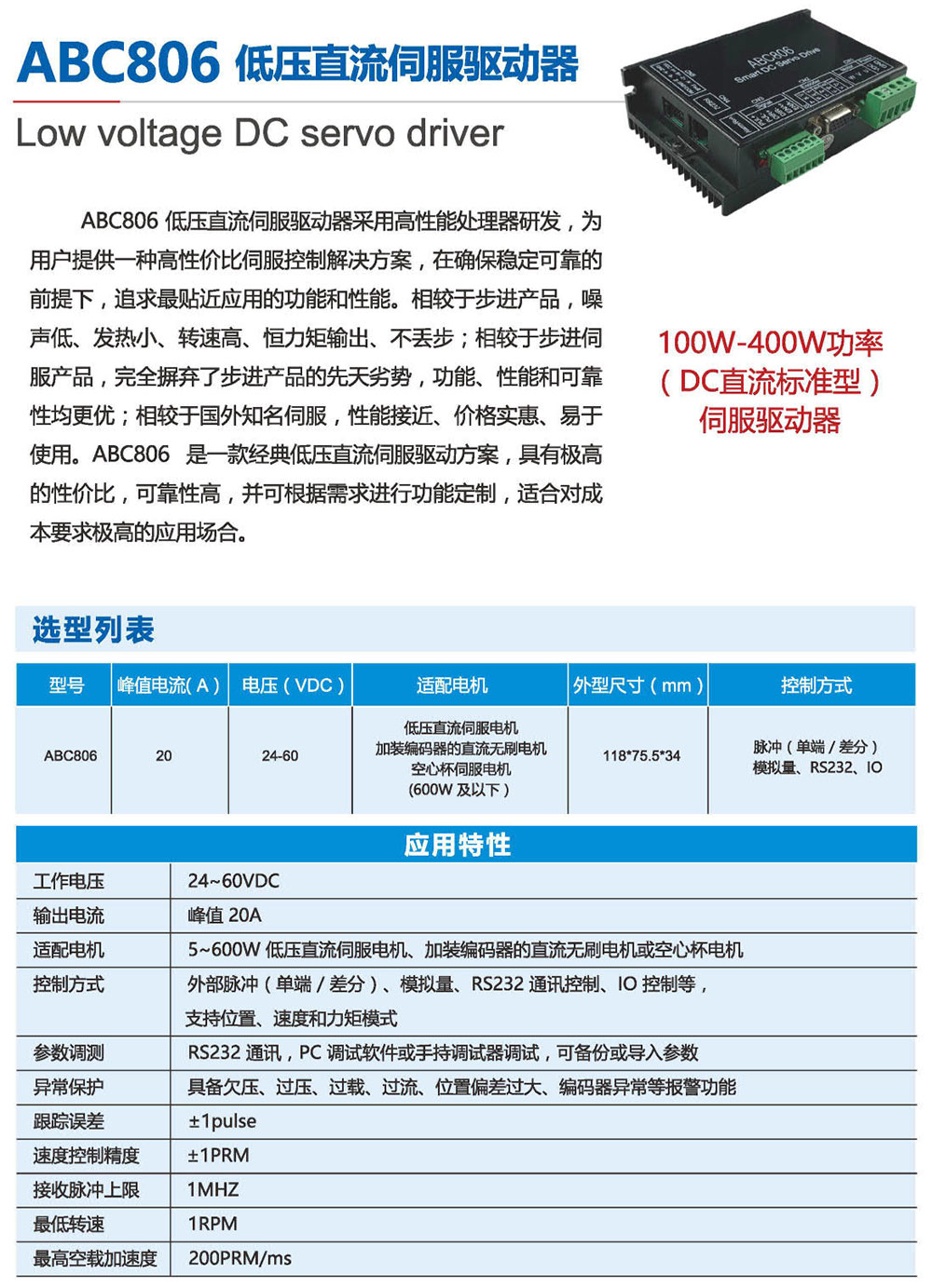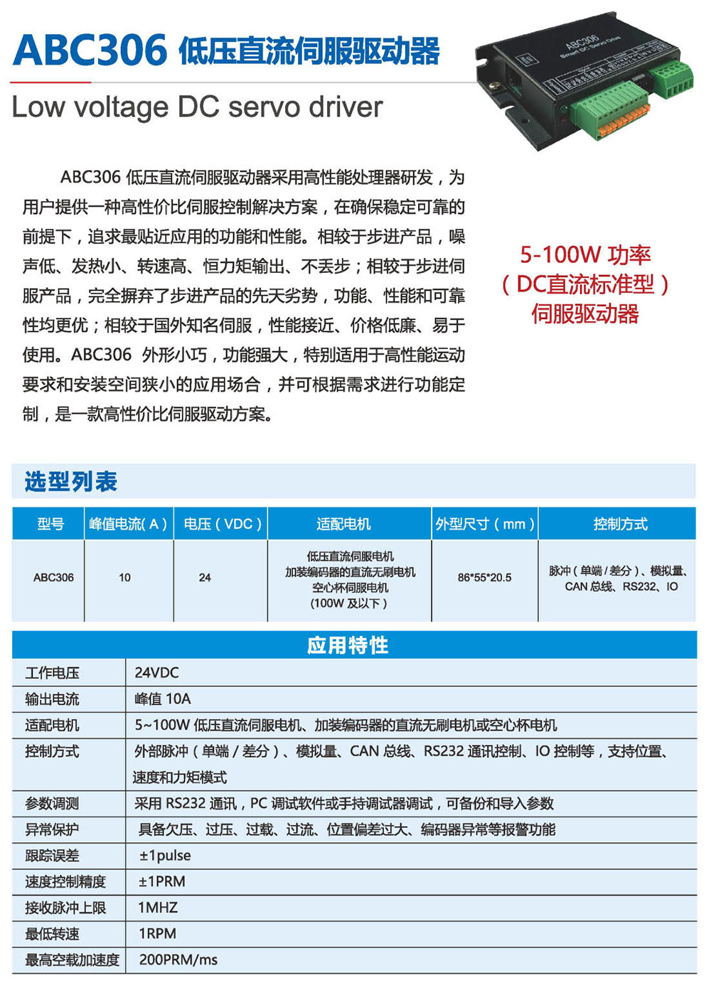 ABC306低压直流伺服驱动器采用高性能处理器研发,为 用户提供一种高性价比伺服控制解决方案,在确保稳定可靠的 前提下,追求贴近应用的功能和性能。相较于步进产品,噪 声低、发热小、转速高、恒力矩输出、不丢步;相较于步进伺 服产品,摒弃了步进产品的先天劣势,功能、性能和可靠 性均更优;相较于国外知名伺服,性能接近、价格低廉、易于 使用。ABC306外形小巧,功能强大,特别适用于高性能运动 要求和安装空间狭小的应用场合,并可根据需求进行功能定 制,是一款高性价比伺服驱动方案。