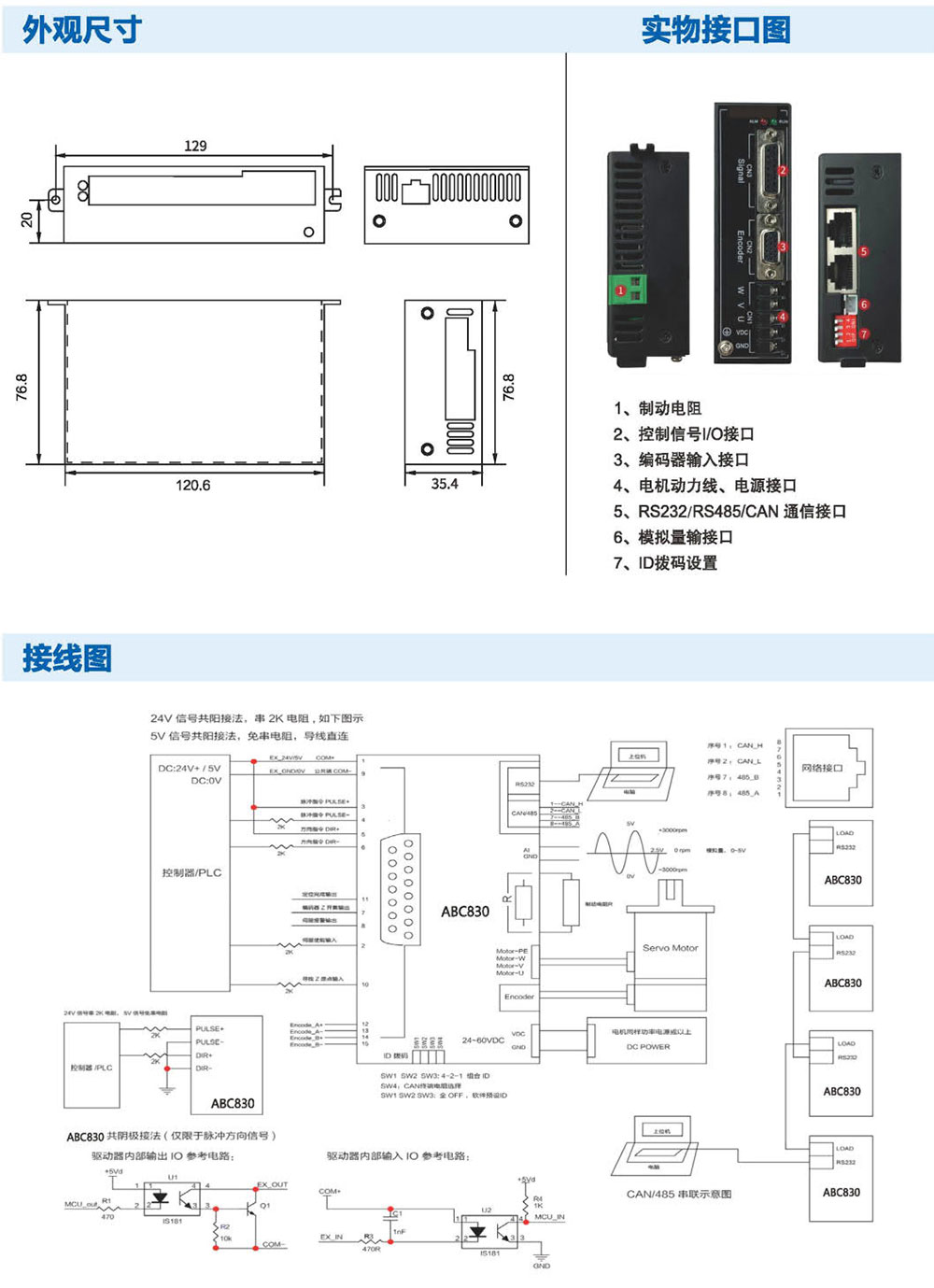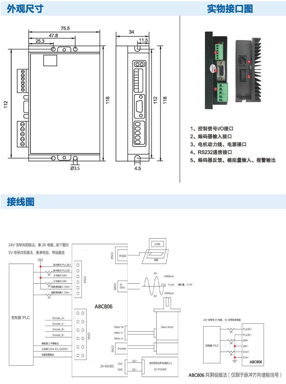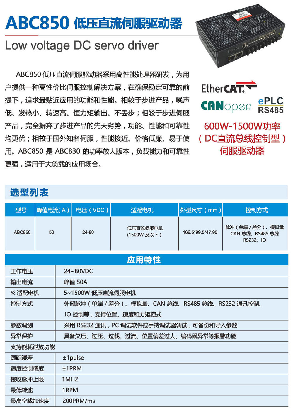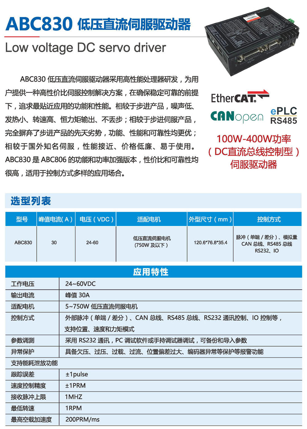 ABC306低压直流伺服驱动器采用高性能处理器研发,为 用户提供一种高性价比伺服控制解决方案,在确保稳定可靠的 前提下,追求贴近应用的功能和性能。相较于步进产品,噪 声低、发热小、转速高、恒力矩输出、不丢步;相较于步进伺 服产品,摒弃了步进产品的先天劣势,功能、性能和可靠 性均更优;相较于国外知名伺服,性能接近、价格低廉、易于 使用。ABC306外形小巧,功能强大,特别适用于高性能运动 要求和安装空间狭小的应用场合,并可根据需求进行功能定 制,是一款高性价比伺服驱动方案。