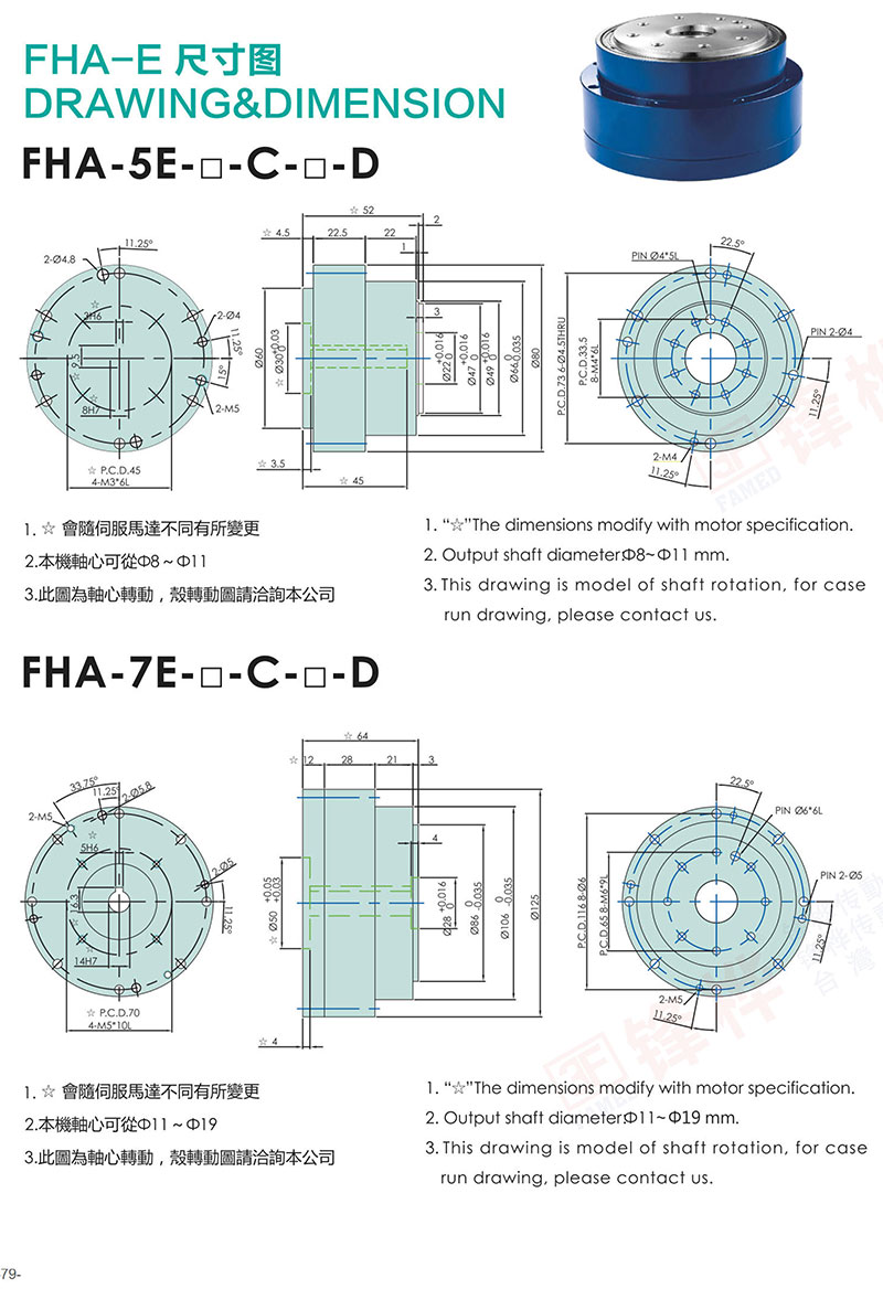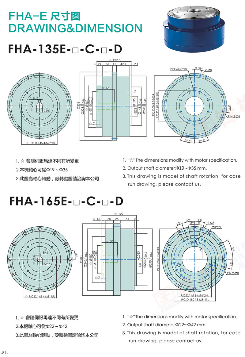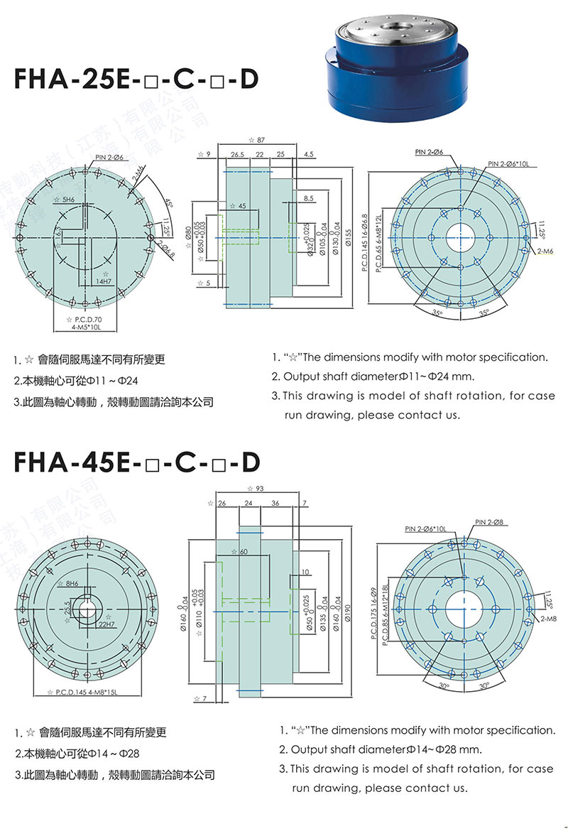 适用于变位机,刀塔,工具机以及伺服马达许直结于减速机中的机台与机构,FHA-E最大的特点是拥有直结的输出,紧固的锁固,并能保证精度。