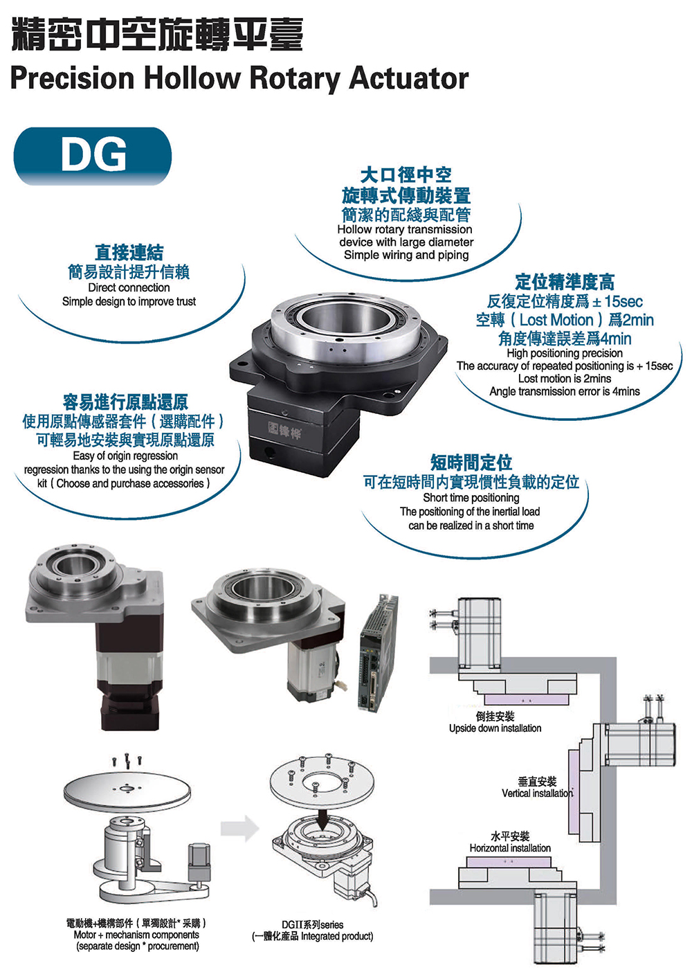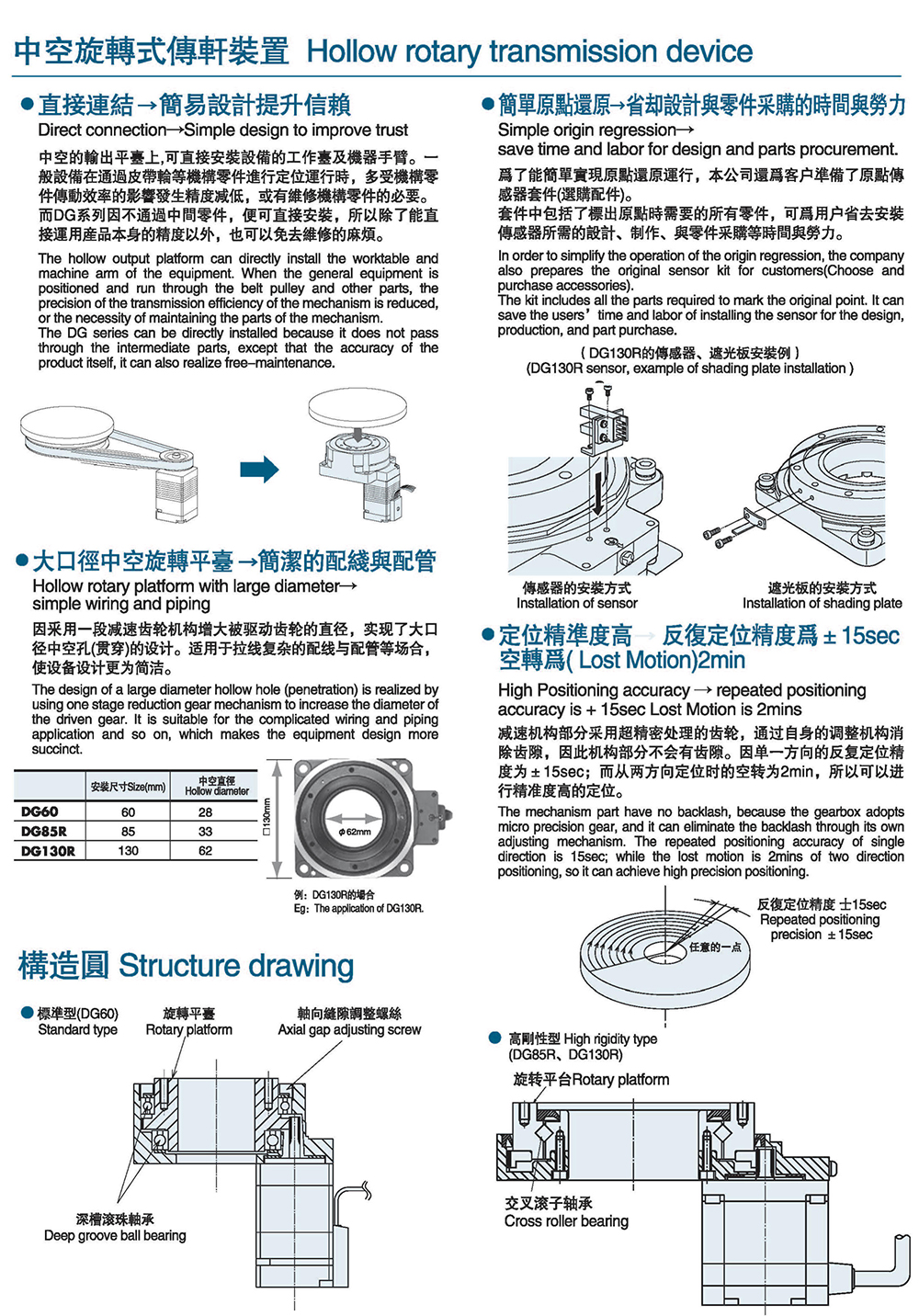 ●直接连接 ●容易进行原点还原 ●大口径中空旋转式传动装置 ●定位精准度高 ●短时间定位