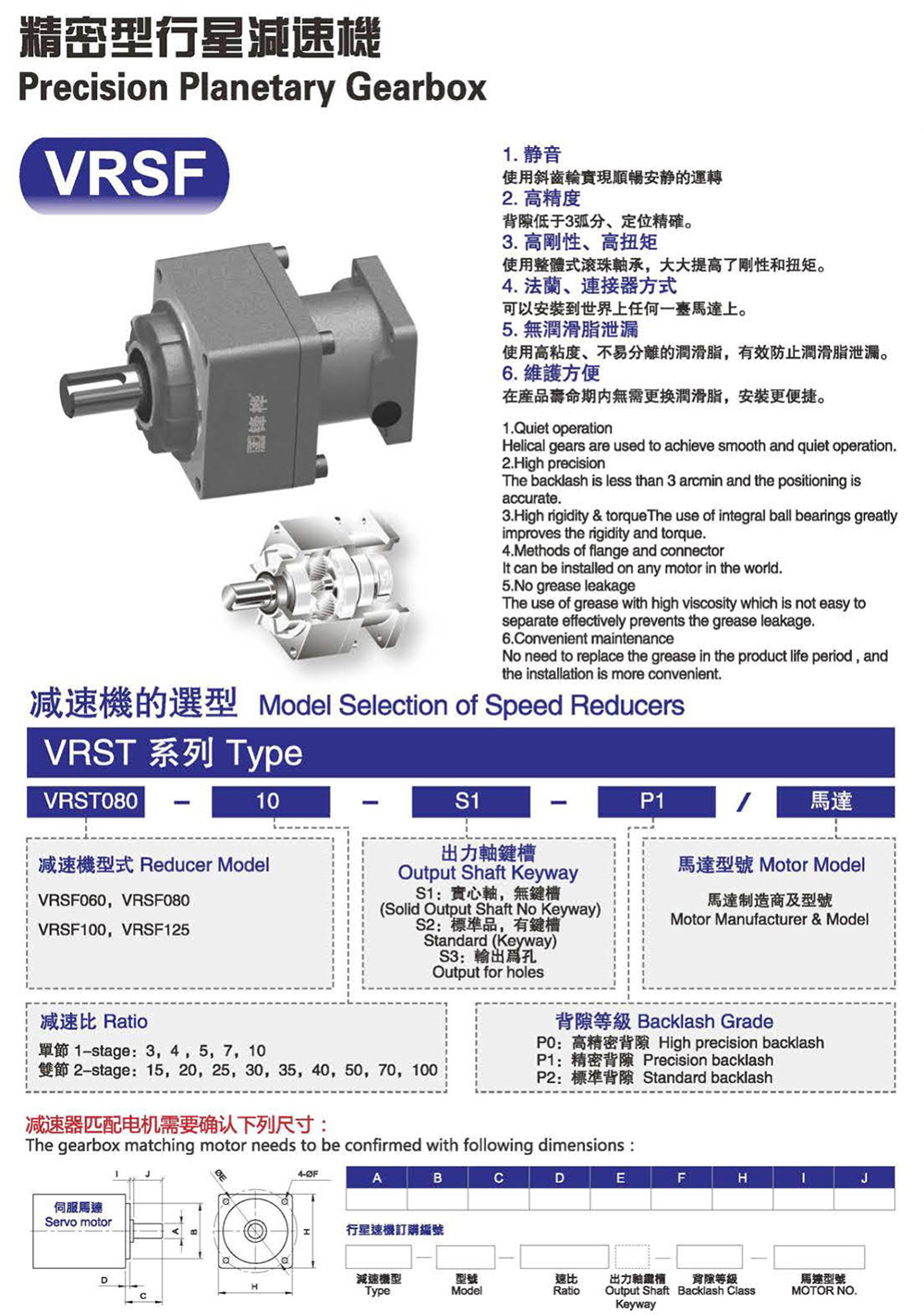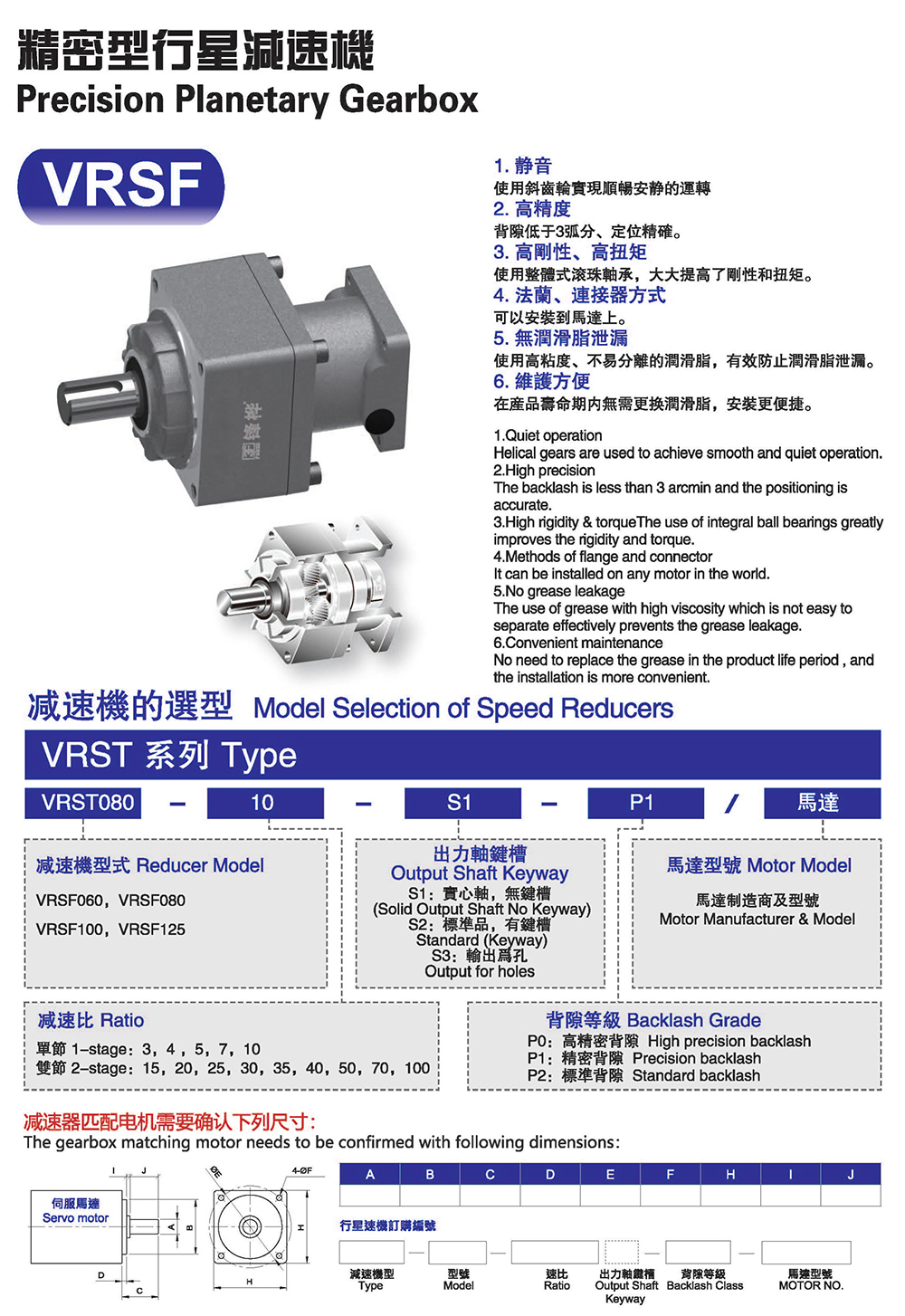 1. 静音 使用斜齿轮实现顺畅安静的运转 2. 高精度 背隙低于3公分、定位精确。 3. 高刚性、高扭矩 使用整体式滚珠轴承,大大提高了刚性和扭矩。 4. 法兰、连接器方式 可以安装到马达上。 5. 无润滑脂泄漏 使用高粘度、不易分离的润滑脂,有效防止润滑脂泄漏。 6. 维护方便 在产品寿命期内无需更换润滑脂,安装更便捷。