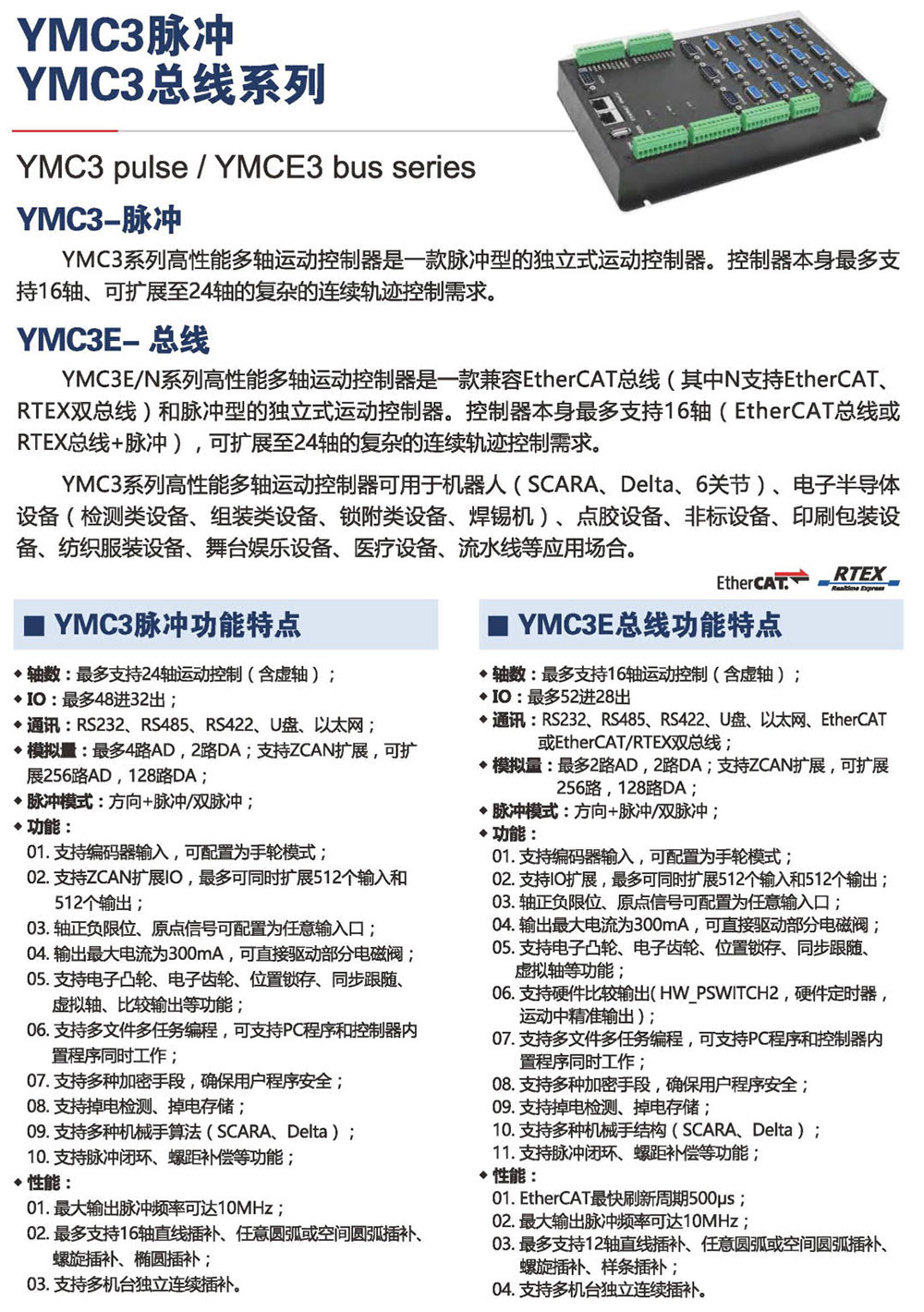YMC3E/N系列高性能多轴运动控制器是一款兼容EtherCAT总线 (其中N支持EtherCAT.RTEX双总线)和脉冲型的独立式运动控制器。控制器本身最多支持16轴( EtherCAT总线或RTEX总线+脉冲) , 可扩展至24轴的复杂的连续轨迹控制需求。