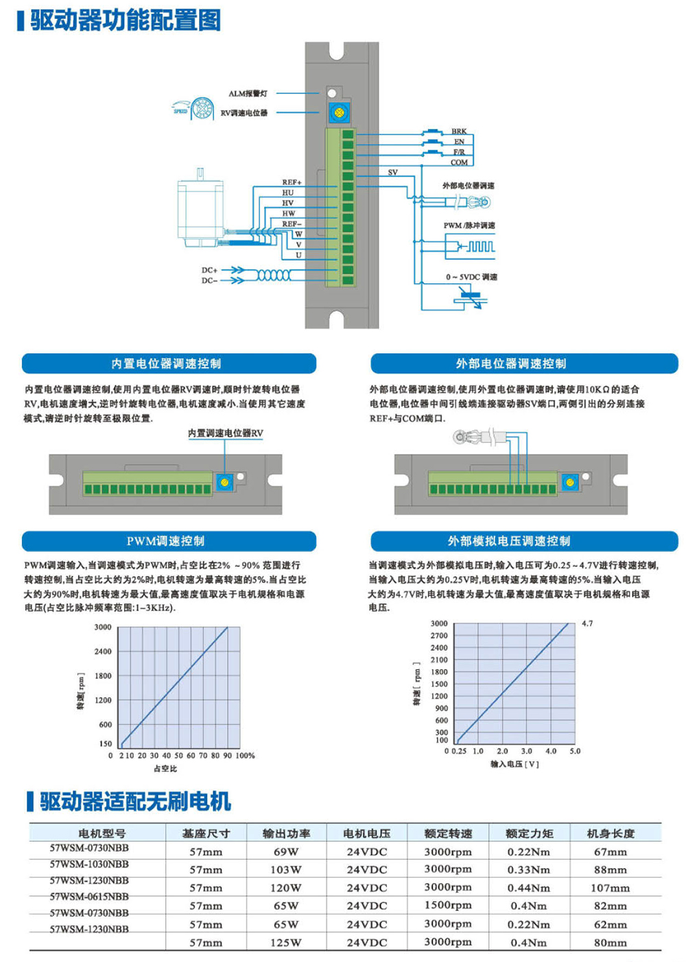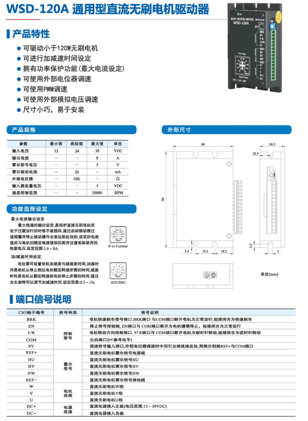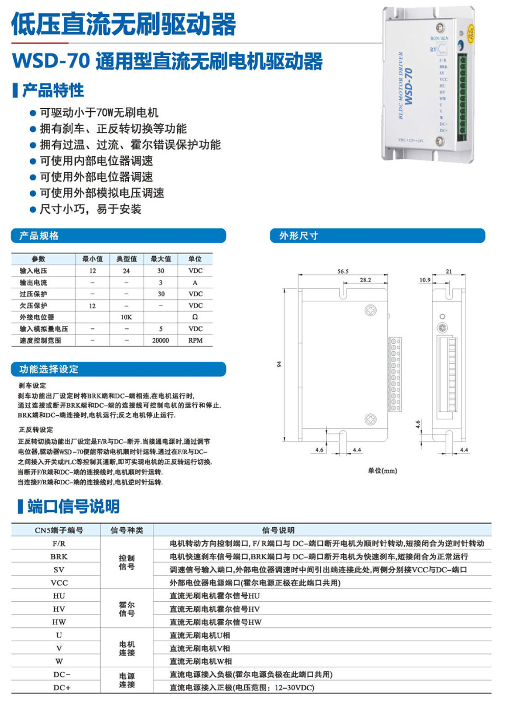●可驱动小于70W无刷电机 ●拥有刹车、正反转切换等功能 ●拥有过温、过流、霍尔错误保护功能 ●可使用内部电位器调速 ●可使用外部电位器调速 ●可使用外部模拟电压调速 ●尺寸小巧,易于安装
