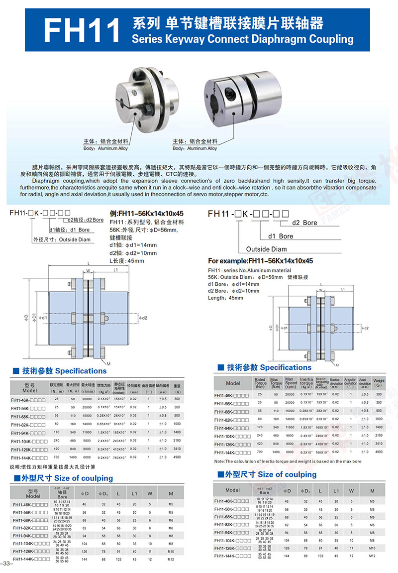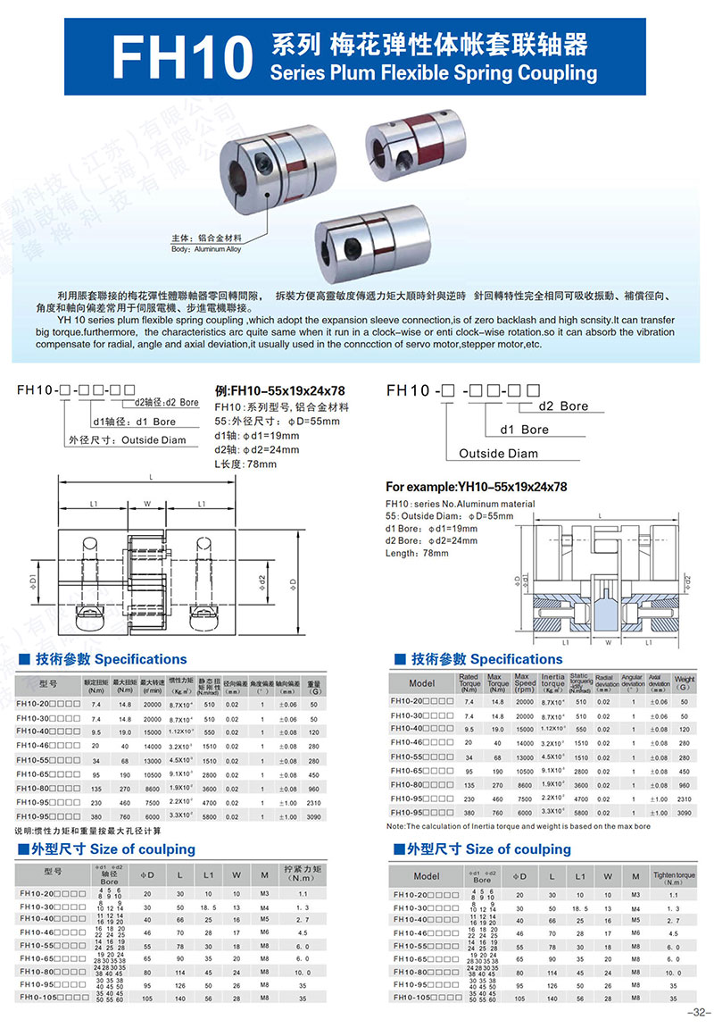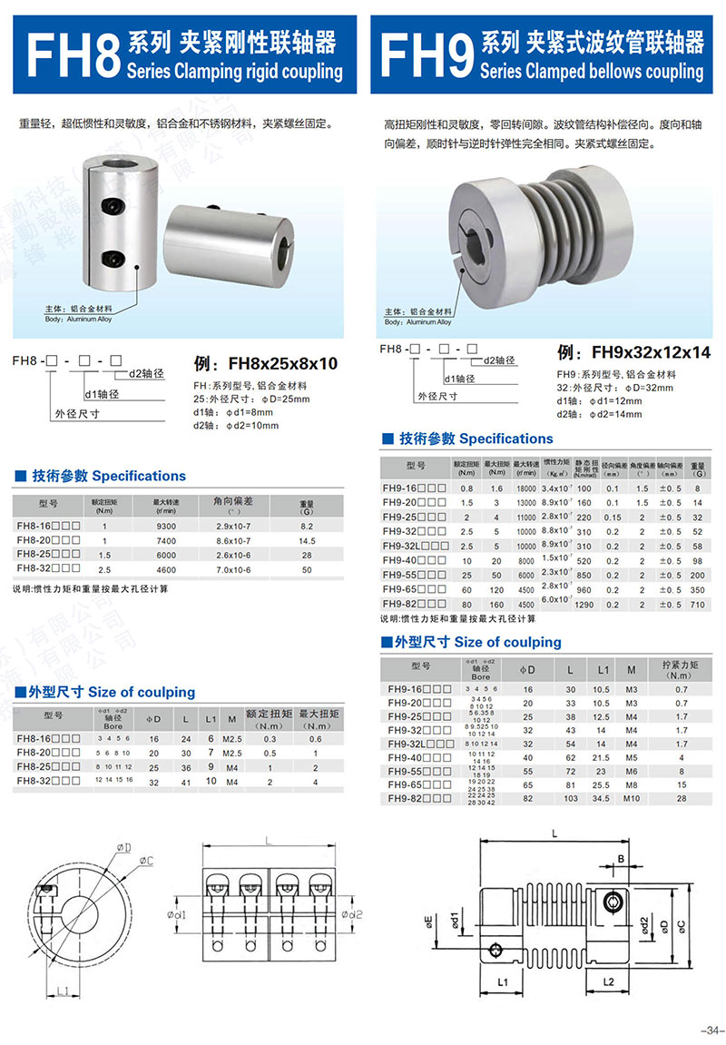 高扭矩刚性和灵敏度,零回转间隙。波纹管结构补偿径向。度向和轴向偏差,顺时针与逆时针弹性完全相同。夹紧式螺丝固定。